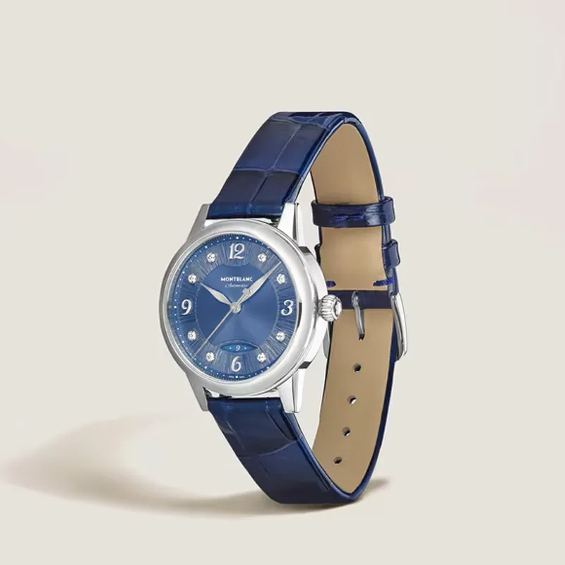 - MB 24.29 automatic movement; displays date via almond-shaped aperture with handwritten numerals